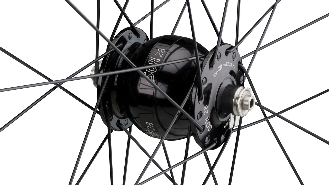 Der Son 28 ist ein universell für alle Laufradgrößen von 16″ bis 29″ zugelassener Nabendynamo. Die Nennleistung erreicht er im 28″ -Rad bei ca. 16 km/h. Damit ist er zu empfehlen, wenn bei langsamer Fahrt besonders viel Licht benötigt wird oder andere Geräte betrieben bzw. deren Akkus geladen werden sollen. Im Vergleich zum Vorgänger konnten die Leerlaufverluste um ca. 15 % und das Gewicht um 140 g verringert werden.