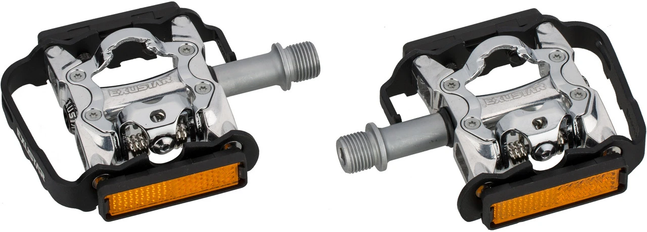 Spezifikationen:Einsatzbereich:MTBAusführung:Käfig-/Klickpedal (Duo-Pedal)Pedalsystem:SPDTechnische Daten:Material Pedalkörper:AluminiumMaterial Achse:StahlLagerung:IndustriekugellagerLieferumfang:1 Paar Käfig-/Klickpedale Exustar E-PM86Reflektoren mit deutscher Prüfnummer ExustarSchuhplattenset/Cleats Exustar