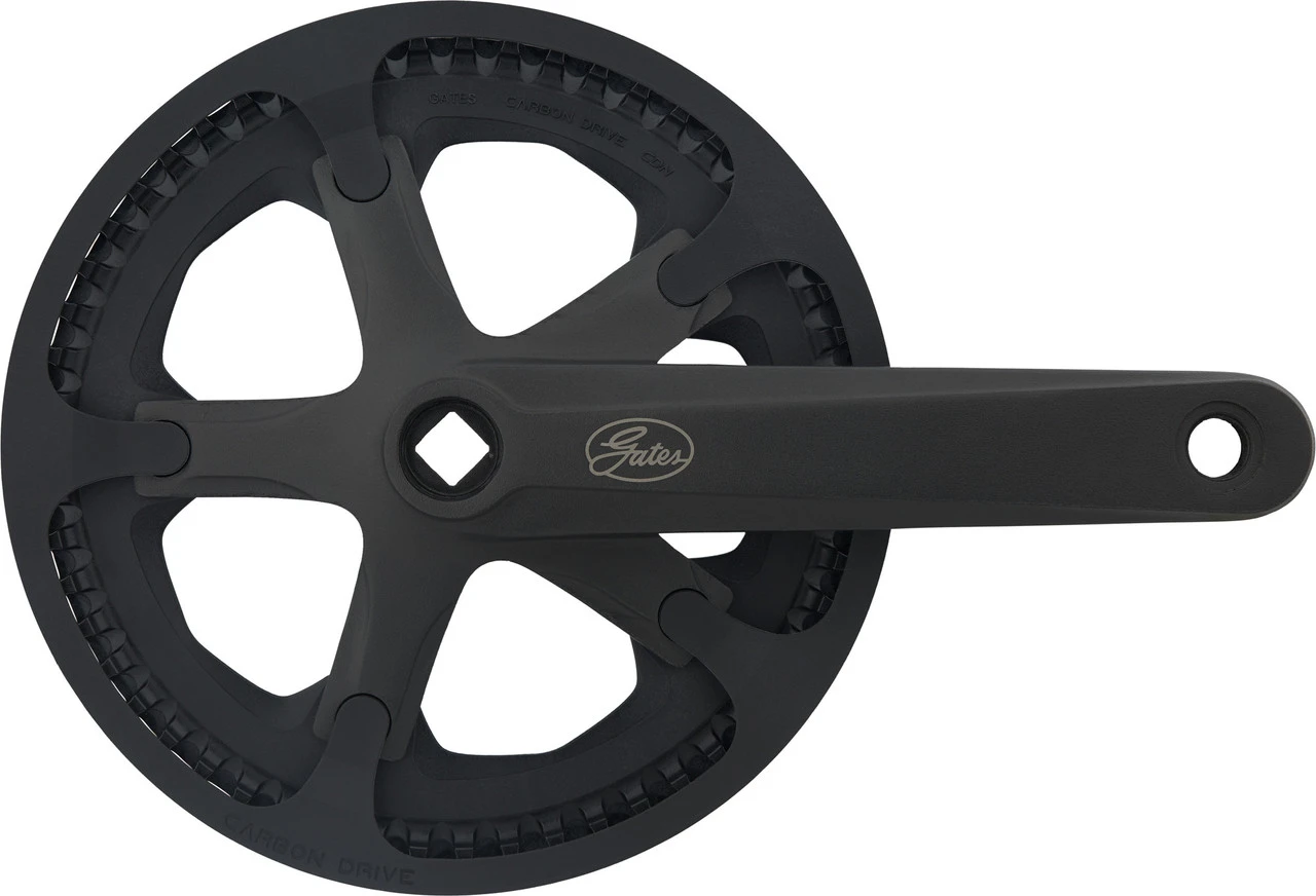 Die S150 Kurbelgarnitur von Gates hat ein durchgehend mattes Finish und kommt mit einer vormontierten CDN Riemenscheibe sowie einem Kunststoff-Schutzring. Das spart Zeit beim Set-up des Riemenantriebs für Dein Citybike.