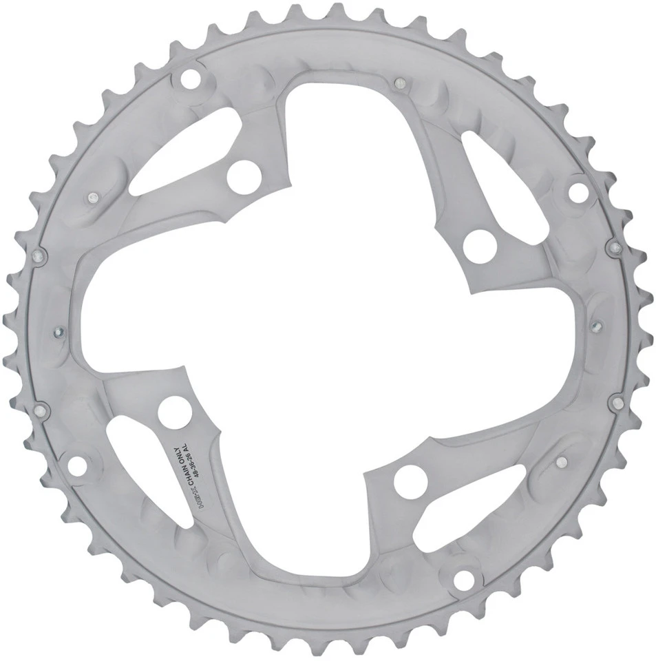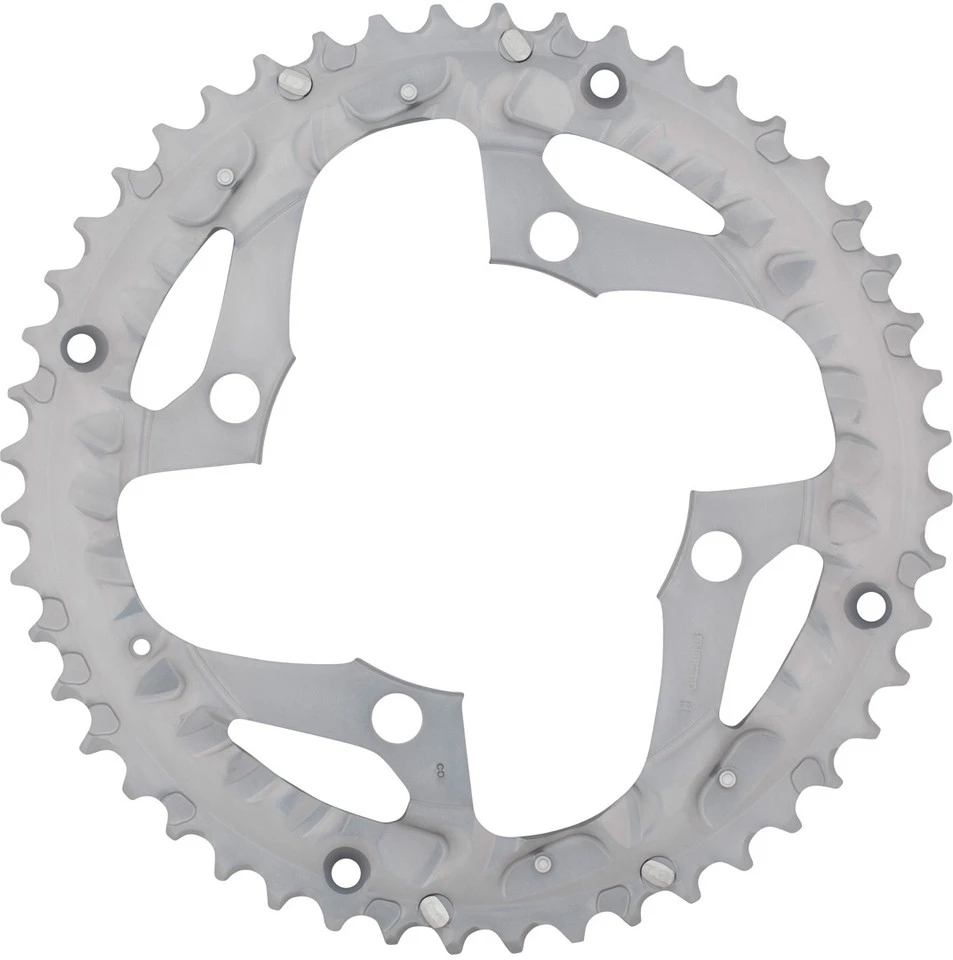 Das Shimano Deore 10-fach Kettenblatt FC-T611 (44 oder 48 Zähne) ist auch in einer Ausführung für Kettenschutzring erhältlich. Es hat einen Lochkreis von 104 mm und besteht aus Aluminium mit silbernem oder schwarzem Eloxal-Finish.
