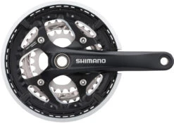 Die Shimano FC-T551 ist eine Aluminium-Kurbelgarnitur im steifen 2-Piece-Design für den Trekking-Einsatz. Sie ist mit drei Kettenblättern sowie einem Kettenschutzring bestückt (104 bzw. 64 mm 4-Arm-Lochkreis) und mit Shimano 10-fach Antrieben kompatibel. Ihr einfaches und robustes Design integriert sich bestens an jedem Tourenrad. Diese Kurbel ist zudem Kettenkasten-kompatibel.