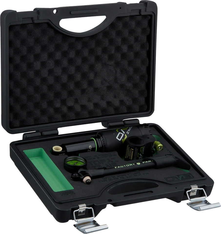 Spezifikationen:Einsatzbereich:Cross Country, All Mountain, EnduroFederung:LuftEinbaulängen x Hub:185 x 52,5 mm, 185 x 55 mm, 205 x 60 mm, 205 x 62,5 mm, 205 x 65 mmDämpferaufnahme:TrunnionTechnische Daten:Dämpfungssystem:T3Material Buchsen:KunststoffMaterial Gehäuse:AluminiumMaterial Schaft:AluminiumLuftkammergröße:HV High Volume NegativeEinstelloptionen:Druckstufe:Ja, 3-Positionen-Hebel (Open / Mid / Firm)Zugstufe:JaRemote:NeinFreigaben:Luftdruck max.:300 psi (Luftkammer), 180 psi (Bladder)Features:komplett überarbeitetes und optimiertes Designgrößere Negativluftkammer als beim Vorgänger reduziert LosbrechkraftT3-Hebel zur Einstellung der Druckstufe in drei Positionen: Closed für effizientes Pedalieren, Medium für wechselhafte Trails und Open für Abfahrtenquer angebrachter Ausgleichsbehälter für besseren Ölfluss und hohe Rahmenkompatibilitäteinfach montierbare Volumenspacer für Positiv- und Negativluftkammer verwendbar, dadurch vielseitige Tuning-Optionensensibles AnsprechverhaltenBladder-Luftdruck zwischen 140 und 180 psi einstellbar zur Anpassung des Fahrverhaltensmit Dämpferpumpekommt in praktischem TransportkofferHerstellernummern:185 mm x 52,5 mm:223-9152T-STD185 mm x 55 mm:223-9155T-STD205 mm x 60 mm:223-9160T-STD205 mm x 62,5 mm:223-9162T-STD205 mm x 65 mm:223-9165T-STDLieferumfang:1 x Dämpfer DVO Suspension Topaz 2 Air Trunnion1 x Dämpferpumpe DVO Suspension5 x Volumenspacer DVO Suspension1 x Koffer DVO Suspension