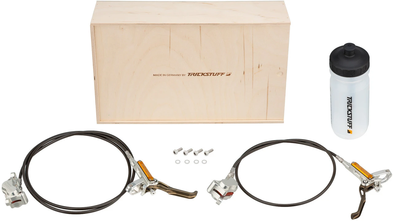 Lieferumfang:1 Paar Scheibenbremsen Trickstuff Maxima, montagefertig befüllt und entlüftet (Vorderrad und Hinterrad)2 Paar Bremsbeläge Trickstuff POWER2 x Bremsbelagssicherungsschraube Trickstuff2 Paar Bremssattelschrauben Trickstuff M6x162 Paar Unterlegscheiben Trickstuff M62 x Befestigungsschelle Trickstuff1 x Trinkflasche Trickstuff2 x Aufkleber Trickstuff1 x Holzbox